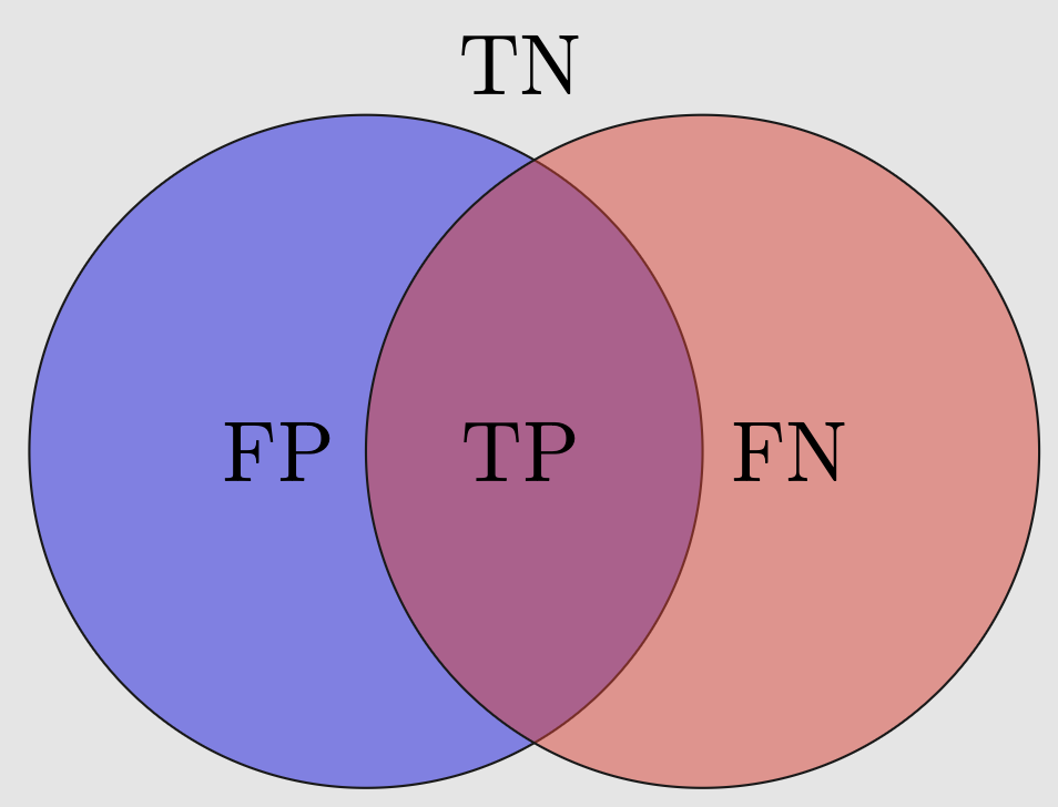 The precision of a class measures the rate of the correct classification among labels classified as the class: p_{\tt 1} = \frac{TP}{TP+FP}\text{ and } p_{\tt 0} = \frac{TN}{TN+FN}. \tag{26.6}