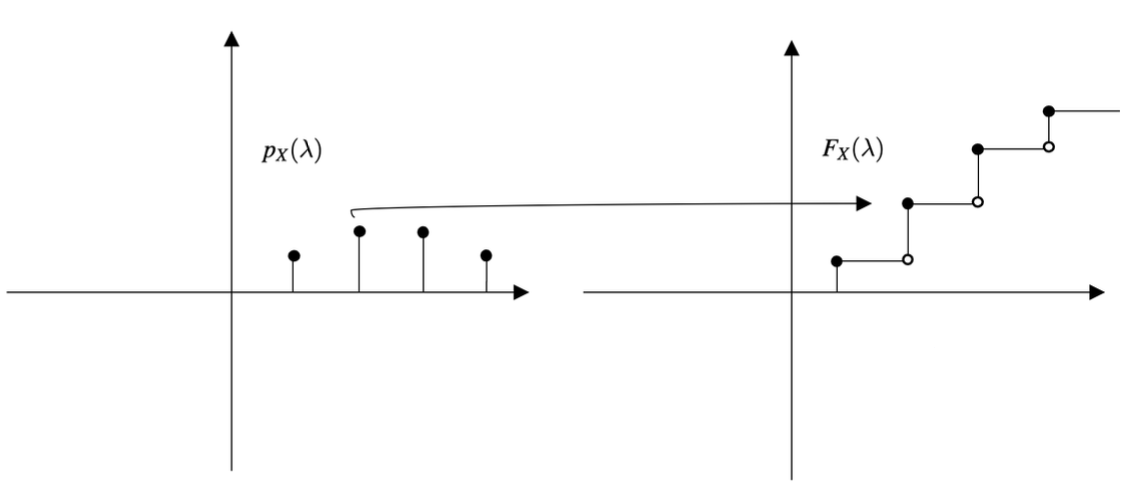 \[ F_{X}(x) = P(X \leq x) = \sum_{k \leq x} p_{X}(k) \]