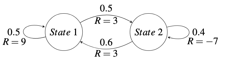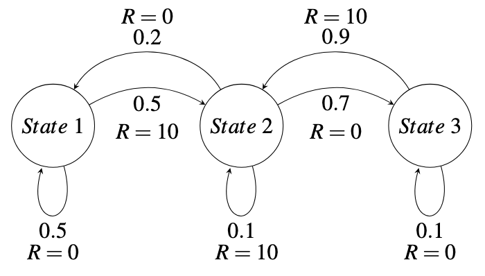 With a discount factor of \(\gamma = 0.9\), calculate \(v(t)\) when \(t = 100\) for the following Markov Chain: