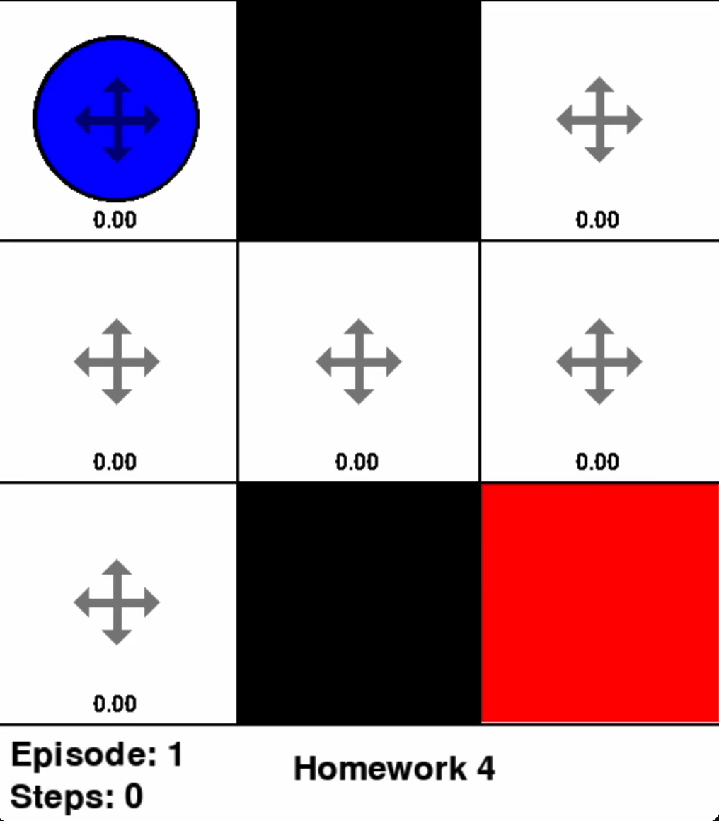Note: The gray shaded areas are barriers. Moving into a barrier incurs a reward of \(R = -1\).