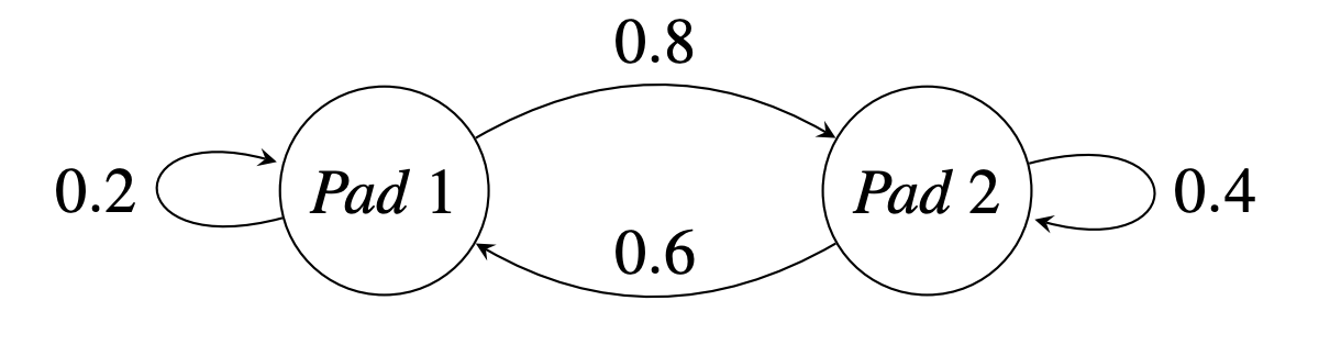 Suppose a frog jumps from one lily pad to another with state transition probabilities: