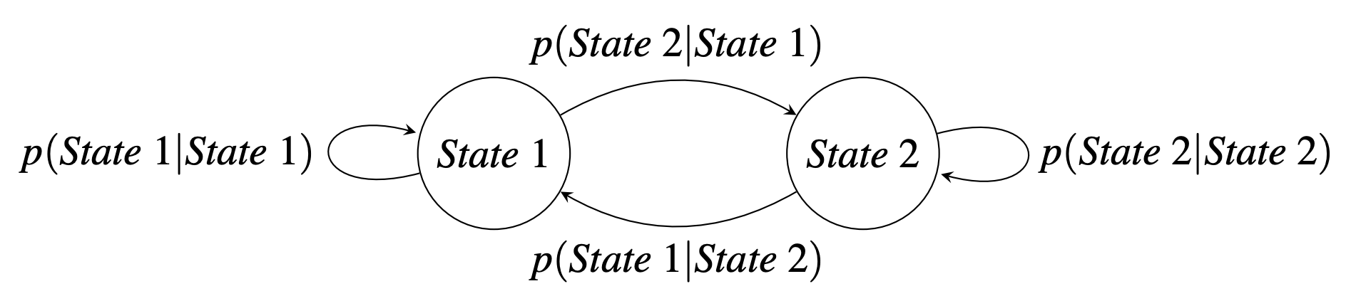 State transitions are conditional probabilities of going to the next state given the current state.