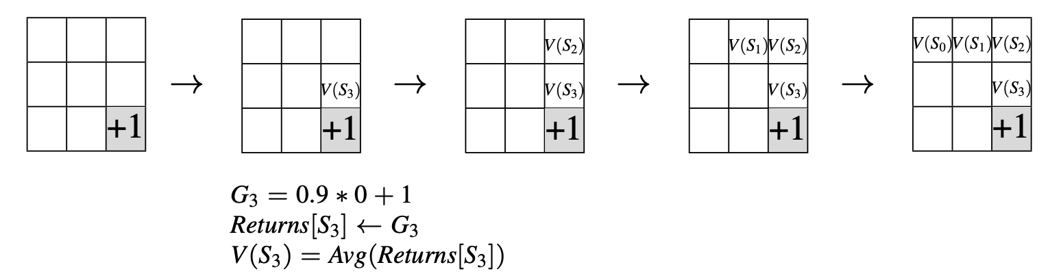 Only on the completion of an episode are value estimates \(v_{\pi}(s)\) and action value estimates \(q_{\pi}(s,a)\) updated.