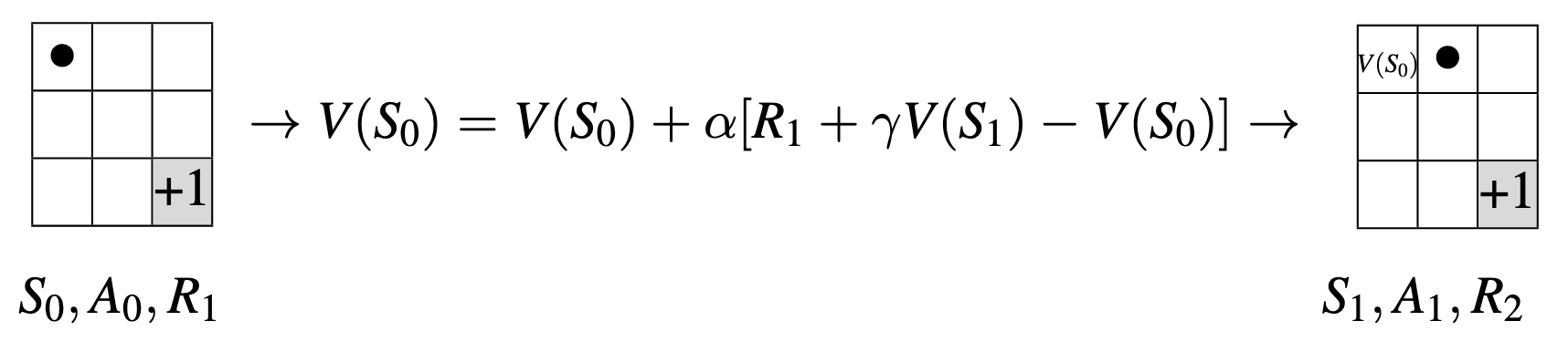 \[ V(S_{t}) = V(S_{t}) + \underbrace{\alpha}_{Step \ Size} [ \underbrace{\underbrace{R_{t+1} + \gamma V(S_{t+1})}_{Target \ Update} - V(S_{t})}_{TD \ Error}] \]